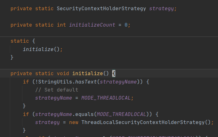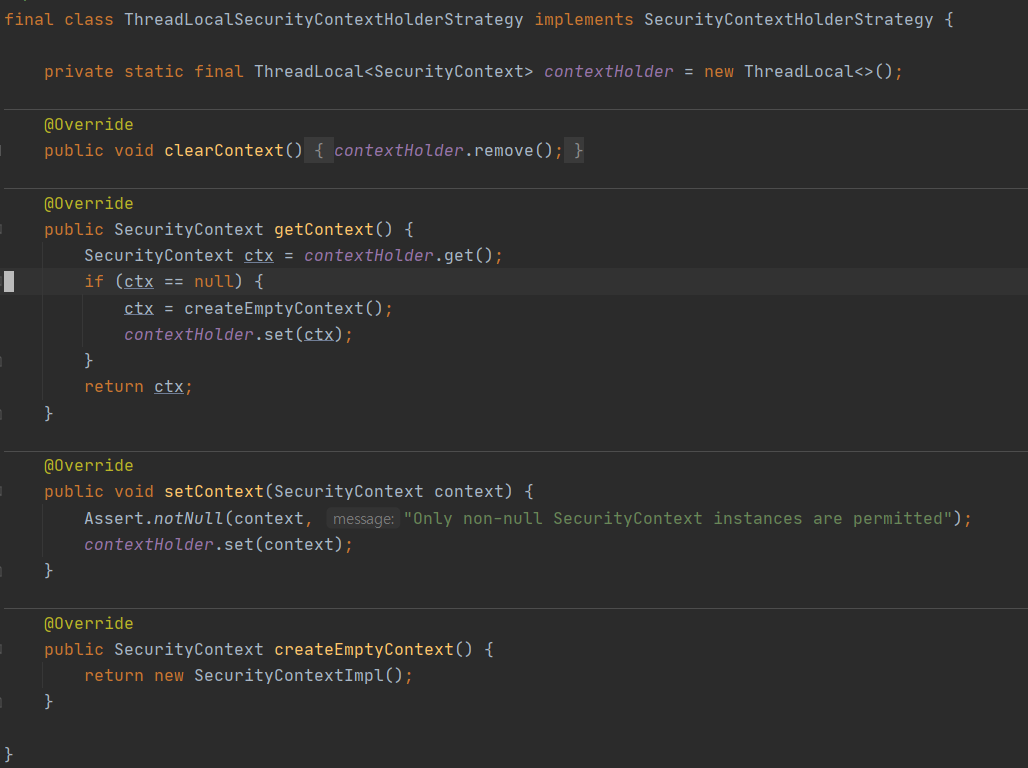 SecurityContextHolderStrategy는 static으로 선언되어 있고 static초기화 블록이 있으니SecurityContextHolder가 처음으로 실행(로딩)되는 시점에 전략이 정해짐을 알 수 있다. 또한 디폴트 전략으로 ThreadLocalSecurityContextHolderStrategy()를 채택하고 있음을 알 수 있다. 결국, 일반적으로 사용하는전략이 ThreadLocalSecurityContextHolderStrategy이고 SecurityContextHolder를 이용해 이 전략의 API를사용하니 ThreadLocalSecurityContextHolderStrategy의 동작 원리를 보자. (이름에서 거의 유추가 가능하지만 실제로 봤을 때 또 어려웠다)