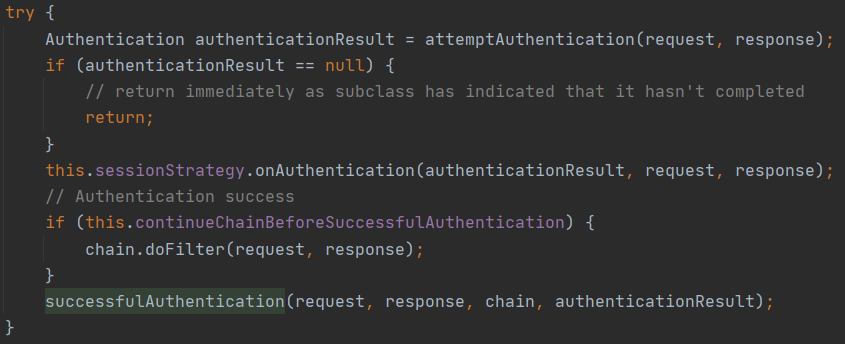 내부적으로 인증을 시도하고(이 메서드는 추상메서드이고 이 메서드를 상속해 인증에 대한 프로세스를 구현한다 -> 템플릿 메소드 패턴) 인증에 실패하면 현재 스레드로컬의 SecurityContext에서 Authenticaiton은 null로 남아 있을 것이다. 반면 인증에 성공해 Authenticaion이 null이 아니라면 successfulAuthentication이 호출된다.