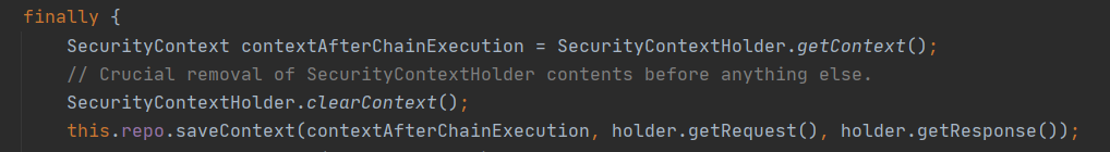 근데 컨텍스트를 클리어하는 시점이 왜 이 필터가 끝나는 시점일까? 시큐리티 필터 또한 내부적으로 본인들의 작업을 전부 처리한 뒤 다음 요청을 넘기는 게 아니라 계속 콜스텍에 쌓인다.