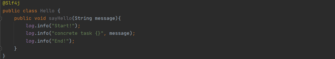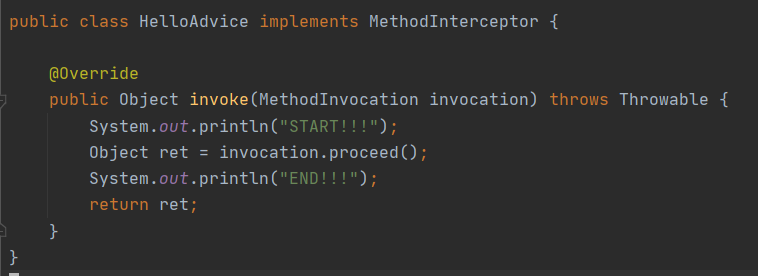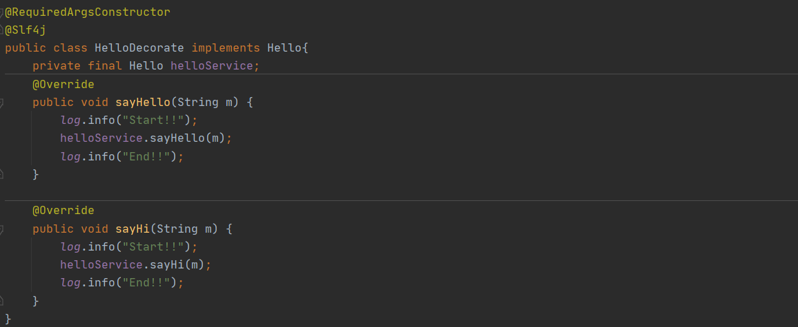 위와 같이 메세지를 전달받으면 간단하게 Hello를 추가한 메세지를 반환하는 오브젝트가 있다고 해보자. Hello서비스를 이용하는 클라이언트는 메세지를 넣으면 자동으로 Hello를 추가해주는 기능에 만족하고 있었다. 이때 클라이언트는 위 메소드가 실행될 때마다 콘솔에 시작을 알리는 텍스트를 찍고 메소드가 끝나기직전에 끝을 알리는 텍스트를 찍어주는 기능을 추가해 달라고 요청했다.