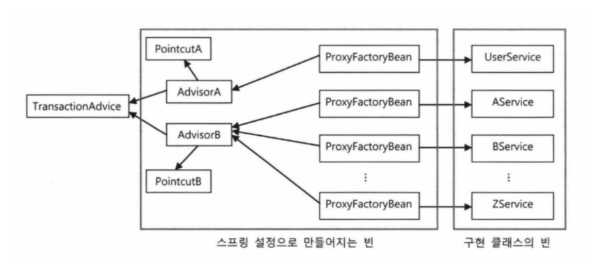 부가기능을 정의한 MethodInterceptor는 타깃의 위임 코드마저 추상화해버렸다. 즉, 하나의 인터셉터를 등록한다면 원하는 타깃에 범용적으로 적용할 수 있음을 의미한다. 위 코드처럼 스프링의 ProxyFactoryBean을 이용하면 addAdvice를 통해 한 타깃에 원하는 만큼 재사용 가능한 부가기능클래스를 등록할 수 있다.(템플릿콜백을 이용) 이제 남은 관문은 재사용 가능한 부가기능을 여러 클래스에 한번에 적용하는 과정이다