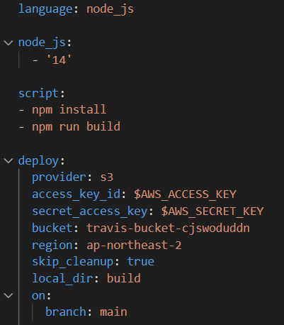 미리 만들어둔 IAM 키를 travisCI에 저장하고 위 스크립트를 적어준다. 주의할 사항은 npm test를 진행하면 오류가 난다는 점과 deploy시 현재 브랜치가 가능하도록 해줘야 한다는 점이다.
