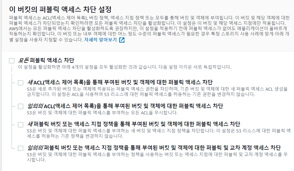원하는 이름과 리전을 선택하고 누구나 접근할 수 있도록 해야하기 때문에 퍼블릭 액세스 차단을 모두 풀어 놓고 나머지는 놔둔 상태로 버켓을 생성하자.