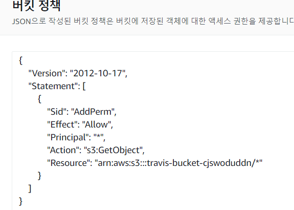 마지막으로 권한으로 들어가서 버켓 정책을 편집한다. json으로 작성할 수 있는데 아래와 같이 작성한다. 본인도 복붙한 내용이라 자세히는 모르지만 직관적으로 현 버켓에 대한 요청을 허용하는 의미 같다.