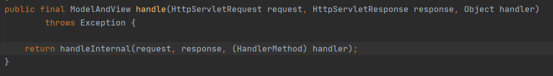 어댑터가 ha이고 ha의 handle()을 이용해 요청을 수행하는 모습니다. 요청, 응답, 수행할 메서드를 파라미터로 넘긴다.