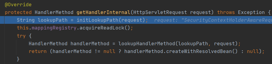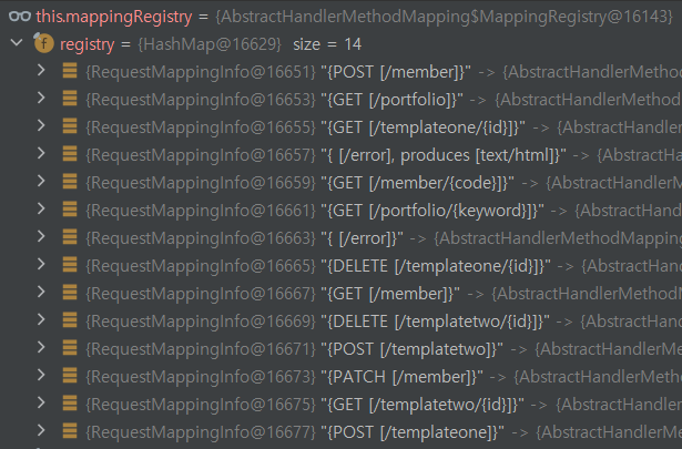 기본적으로 등록되는 5개의 핸들러매핑이 있고 여기서 우리가 Controller로 등록한 클래스를 찾기 위해 각 핸들러 매핑이 제공하는 서비스를 확인해야 한다. 일반적으로 핸들러를 등록하는 방법인 @RequestMapping으로 등록하는 핸들러는 RequestMappingHandlerMapping의 mappingRegistry에 정보가 담겨 있다.