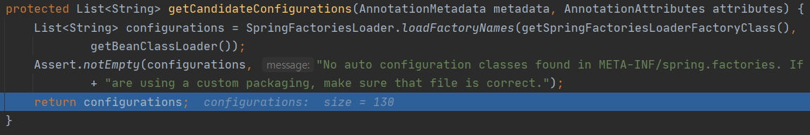 그리고 기본적으로 META-INF/spring.factories에서 자동설정 후보가 될 클래스를 String으로 가져오고 130개나 가져오는 걸 확인할 수 있다. 여기에는 자동설정 지원하는 모든 클래스가 포함되고 프로젝트에서 사용하는 대부분의 오픈소스 프레임워크는 다 들어 있다고 보면 된다(security, jpa 등등)