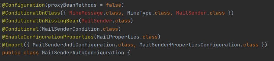 @Configuration을 통해 빈 설정 클래스임을 확인하고 @ConditionalOnClass를 통해 MimeMessage, MailSender 클래스가 라이브러리로 추가되었는지 확인한다. @ConditionalOnMissingBean을 통해 MailSender의 중복 등록을 막아주고 위조건을 통과했으면 @Import를 통해 MailSenderJndiConfiguration을 수행한다.