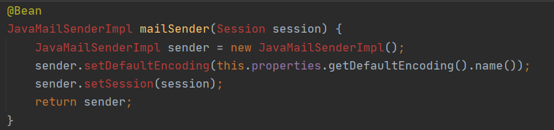 MailSenderJndiConfiguration 클래스의 빈 등록 메서드이며 이 메서드 수행을 통해 리턴되는JavaMailSenderImpl 객체는 내가 원하는 곳에 AutoWired해서 사용할 수 있다.