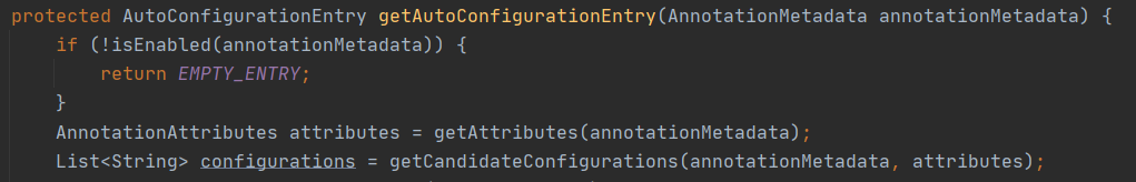 AutoConfigurationImportSelector에서 자동설정을 위한 엔드리를 얻는 과정인데getCandidateConfigurations()를 통해 후보가 될 엔트리를 전부 가져온다.