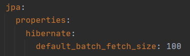 우선 조회할 컬렉션이 둘 이상인 경우 데이터의 양은 1*N*M*...으로 매우 커진다. DB는 이러한 결과밖에 줄 수 없고 결국 이를 처리하는 건 JPA의 몫이다. 1:N까지는 어찌어찌 해결했지만 그 이상은 무리인 듯하다. 결국 join fetch를 포기하면 N+1문제는 발생할 수밖에 없다. 이때 application.yml에 옵션을 추가해주자.