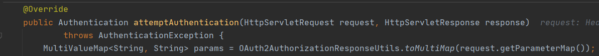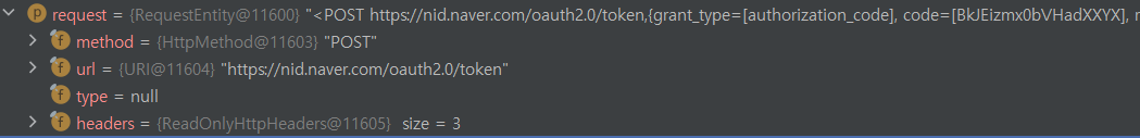 네이버는 서버로 두 파라미터를 담아 보내는데 code를 주목해야 한다. 이 code를 가지고 네이버에게 accessToken을 받아와야 한다. 여기서 디버깅하는 데 시간이 오래 걸렸다. code를 받은 요청에서 응답으로 당연히 새로운 요청을 nid.naver.com/oauth2/token?code=..으로 요청할줄 알았다. 그런데 이 하나의 필터에서 code를 받고 accessToken까지 받아오는 상황이 벌어진 것이다. 설마 accessToken을 현재 서버에서 만드나하는 말도 안되는 의심을 했고 깊게 디버깅하면서 답을 찾았다.