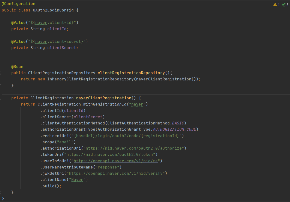 - 커스터마이징한 ClinetRegistration이 @Configuration과 @Bean을 통해 빈으로 등록했다.