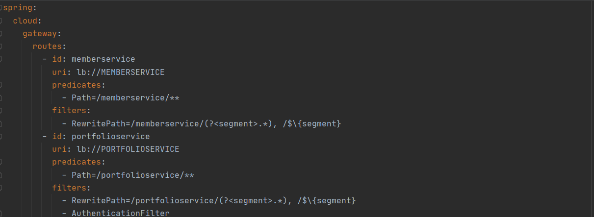 이와 달리 요청이 portfolioservice/**로 오는 요청이라면 AuthenticationFilter를 적용하도록 했다.