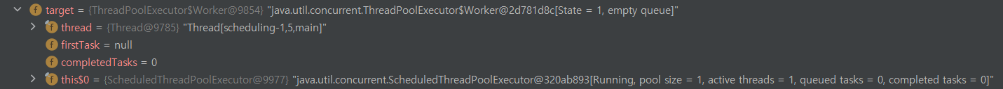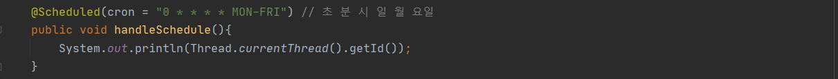 기본 설정으로 스레드1개를 갖는 스레드풀을 생성해 스케줄대로 수행한다. 반복 실행해도 동일한 스레드가 작업하는 걸 확인할 수 있다. SchedulingConfigurer를 구현한 클래스를 빈으로 등록해 스레드풀 설정을 커스텀할 수 있지만 굳이 다수의 스레드를 사용하느 스케줄링이 필요할지는 모르겠다. 나중에 여유가 있다면 스케줄러가 정해진 시간에 어떻게 프로세스를 실행하느지 조사해봐도 재밌을 것 같다.