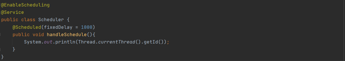 빈으로 등록된 클래스에 @EnableScheduling를 붙여주고 스캐줄러 클래스에 빈을 주입할 걸 생각해 @Service애너테이션을 붙임으로써 빈으로 등록했다. 마법처럼 @Scheduled애너테이션 하나로 스케줄링된 태스크를 수행하는 메서드를 작성할 수 있다. fixedDelay는 이전 작업이 끝난 시각을 기준으로 밀리초 후에 다음 작업을 수행한다. 값을 1000으로 주면 이전 작업이 끝나고 1초 후에 다시 작업을 수행한다. 단일 스레드에서 작업을 지속적으로 이루어지고 시스템 시각 1초당 1번이 아닌 걸 주의하자.