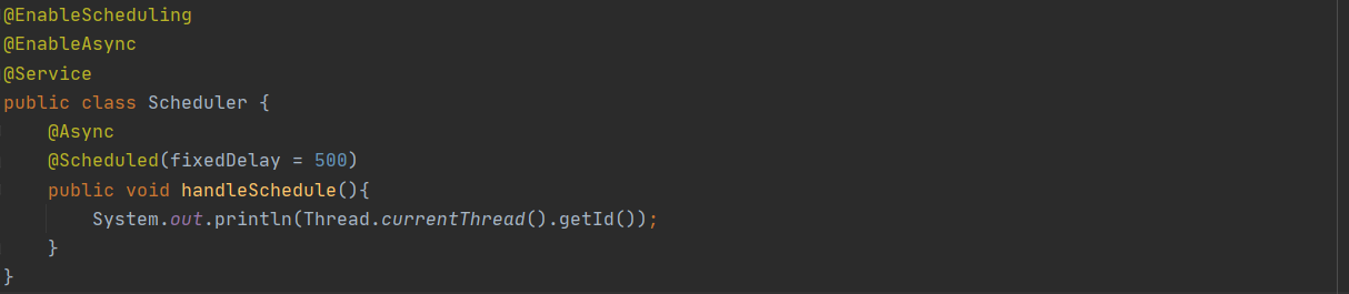 @Async 애노테이션을 붙이면 멀리스레드로 작업을 처리할 수 있다. fixedDelay설정에선 큰 의미가 없을 거고 fixedRate환경에서 즉, 이전 작업 시작 시점으로 일정간격으로 실행하는 작업이라면 의미가 있을 것이다. 첫 코드는 같은 스레드 아이디가 출력는 걸, 위 코드는 각각 다른 스레드 아이디가 출력되는 걸 확인할 수 있다.