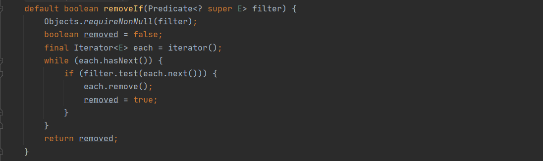 인터페이스 Collection의 default메서드인 removeIf를 확인할 수 있다. boolean반환형과 매개변수 하나를 받는 filter는 removeIf() 내부에서 참거짓을 판별하는 기준을 정한다. 전형적인 템플릿콜백패턴이다.