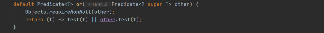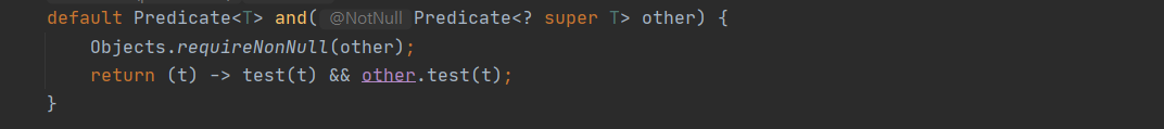 Predicate의 합성을 위한 and이다. 이또한 직관적으로 결괏값을 인스턴스의 조건과 콜백의 조건을 &&하여 참거짓을 판별한 걸 확인할 수 있다.
