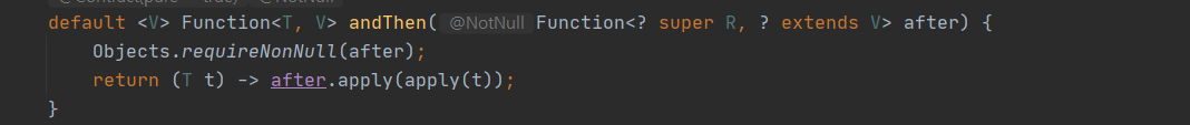 Function<t, v="">인 경우 andThen(Function<a, b="">)를 이용하면 순서대로 적용한 합성을, compose(Function<a, b="">)를 이용하면 역순으로 적용한 합성을 할 수 있다. 실제 default 구현부를 보면 직관적으로 어렵지 않다.