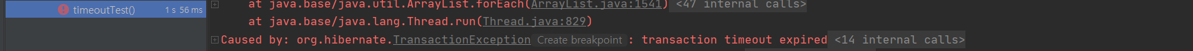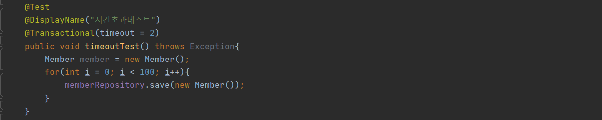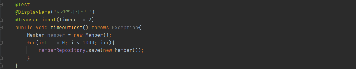 애플리케이션의 한 트랙잭션에서 수행하는 모든 Statememt가 수행될 때 유효한 timeout이다. spring의 @Transactional(timeout = )으로 직접 설정이 가능하며 default로 시스템 timeout을 이용한다. Thread Local에Connection정보를 저장한 뒤 경과시간을 체크하여 예외를 발생시킨다. timeout이 2초인 트랜잭션에서 100번의 쿼리는 성공하는데 반해 1000번의 쿼리는 TransactionException이 발생하고 원인으로 timeout이 나오는 걸 확인할 수 있다.