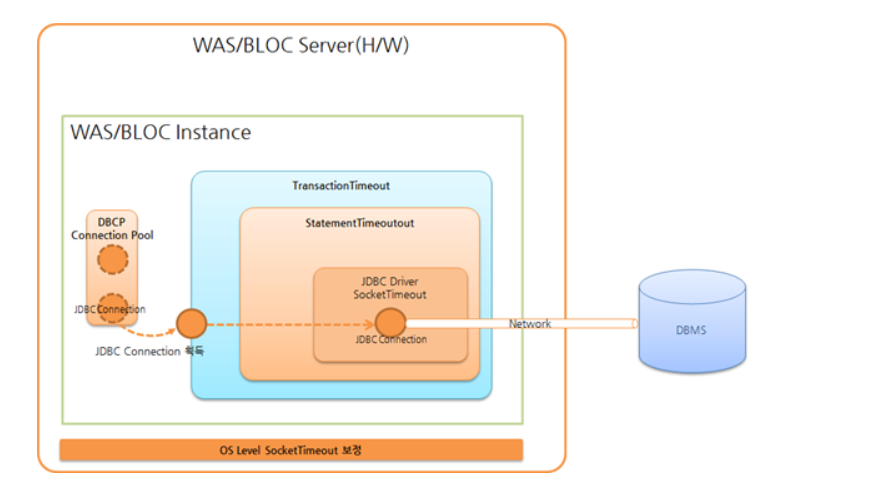 물론 JDBC는 OS Socket Timeout에 종속됐기 때문에 시간이 지나면 자원은 회수되지만 일반적으로 OS Socket Timeout는 긴 편이다. 절절히 socket timeout을 설정하여 네트워크 장애 또한 상대 서버 장애로 인한 무응답 상태에 대처할 수 있다. (timeout 계층도에서 언급했지만 최하단인 JDBC Driver Socket Timeout에서 무한 대기 상태에 빠지만 상위 timeout은 무의미한 값이 된다)