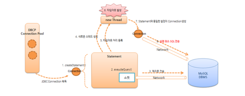 - timeout이 발생하면 timeout처리 스레드가 DBMS로 직전 쿼리 취소 쿼리 호출