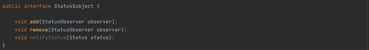 이벤트가 발생한 시점에 구독자에게 영상을 전달하는 크리에이터라고 생각하면 쉽다. add()는 구독자를 추가하고, remove()는 구독취소를 처리하고, notifyStatus()는 영상이 업로드됨을 알리는 기능을 수행한다. 내부적으로 구독자를 관리하는 방법은 DB가 될 수도, 인메모리 List일수도 있다. 인터페이스를 구현한 클래스에서 담당하면 된다.