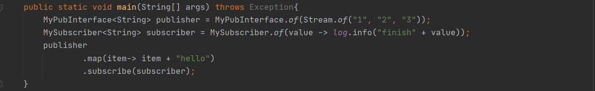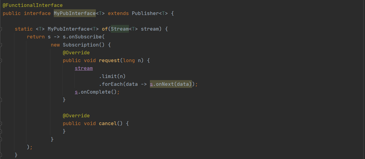 static 메서드를 통해 Stream 데이터소스를 받은 Publisher는 내부적으로 스트림을 반복하도록 구현했다. Subscriber는 총 4가지 메서드를 구현해야 하는데 그 중 핵심 메서드인 onNext()만 of메서드에서 콜백을 전달받으면 오버라이딩하도록 구현했다. 여기서 onSubscribe()를 보면 내부적으로 subscription을 수행하도록 약속되어 있다.