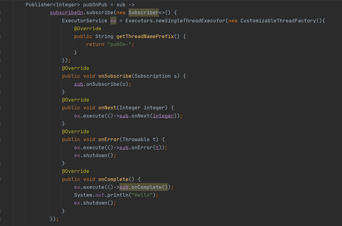 위 예제의 경우 모든 작업이 한 스레드에서 일어난다. 사실상 Stream API와 거의 동일해 보인다. 다만, Subscriber의 작업이 DB통신이나 IO같은 굉장이 오래 걸리는 작업이라면? 아니면, Subscriber에게 subscribe를 호출하기 전 Publisher의 작업이 마찬가지로 오래 걸리는 작업이라면? 비동기 처리를 고려해봐야 한다. 사실 Reactive Stream의 핵심이다.