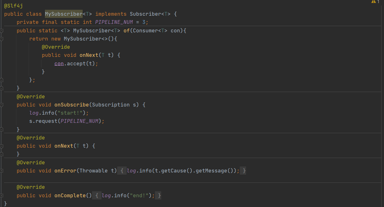 - onNext()를 오버라이딩할 때 기존 Subscriber의 onNext()를 그대로 사용하지만 전달할 스트림데이터소스만 콜백을 적용한다. 즉, onNext(func(func(item))) 이런 모양이 최종적으로 됨을 예상할 수 있다.