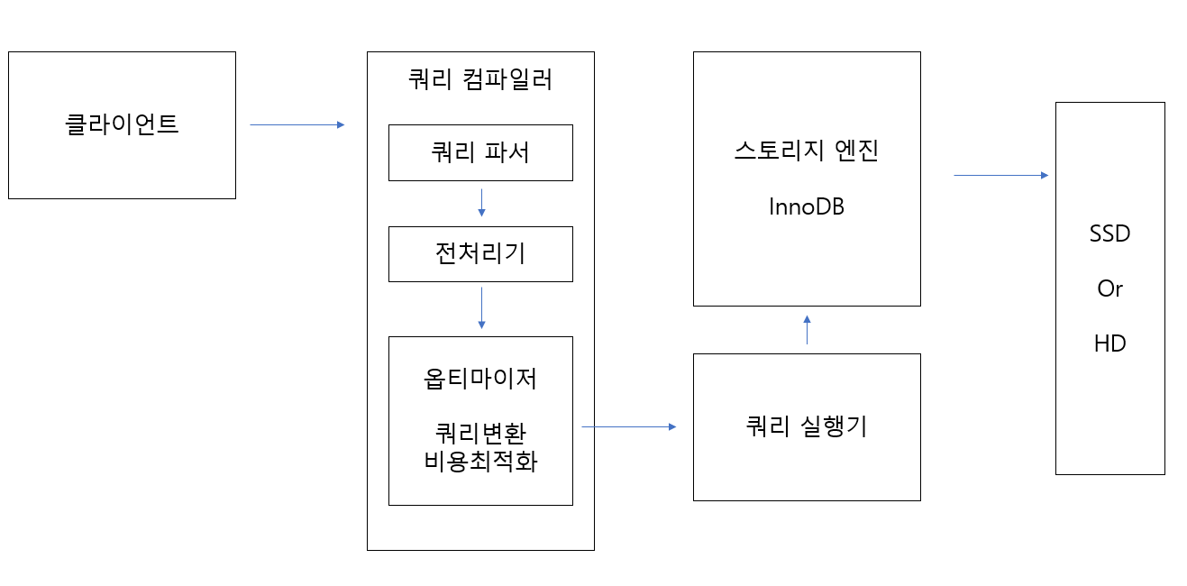 - 쿼리 실행기 : 핸들러를 이용해 스토리지 엔진에게 결과 요청 및 결과 사용자에게 반환