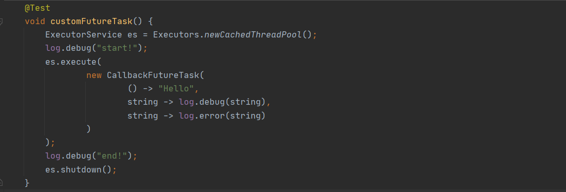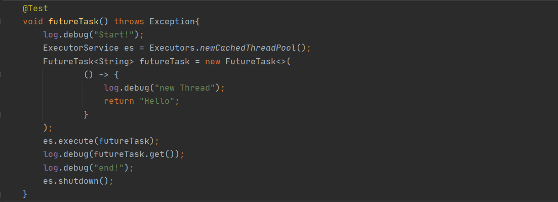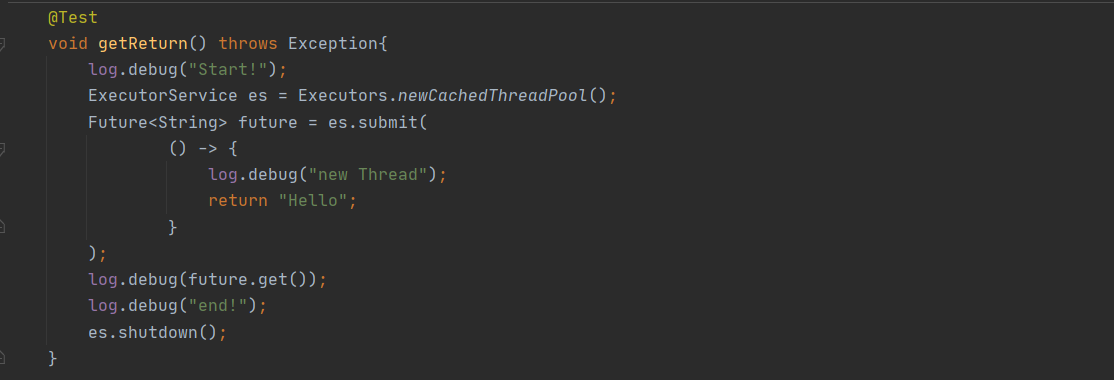 이번엔 submit()함수를 사용해 반환값을 지정할 수 있는 Callable을 람다로 넘겨 Future객체를 리턴받았다. (Callable은 Supplier와 같이 반환형만 있는 concurrent패키지의 펑셔널인터페이스다) 놀라운 건 서로 다른 스레드인데 그 값을 get()으로 받아오는 상황인데 당연히 get()을 하는 시점에 메인스레드는 블락상태가 된다.