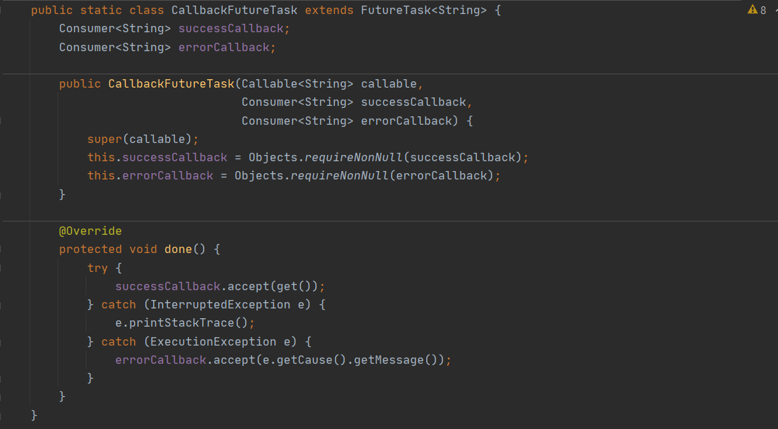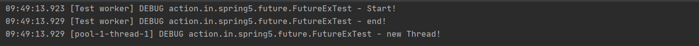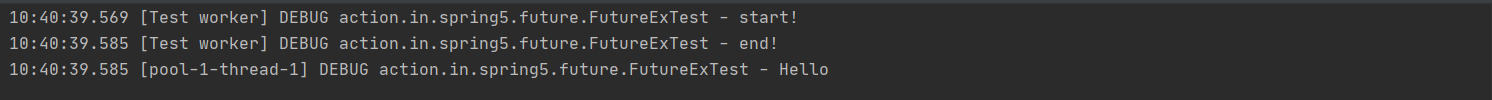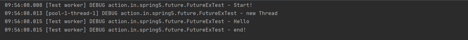 FutureTask는 내부적으로 작업을 끝내고 done()을 호출하는 구조다. done() 구현은 빈구현으로 되어 있으며 위코드처럼 오버라이딩한 경우 기능을 수행할 수 있다. 결과는 메인의 작업과 새스레드의 작업이 완전히 non-blocking방식으로 구현된 걸 확인할 수 있다.