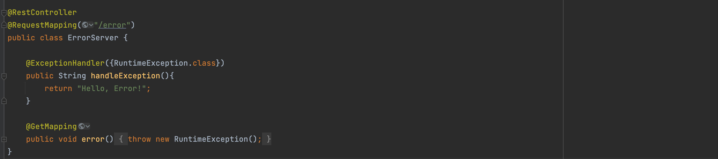 이런식으로 컨트롤러에서 에러를 핸들링하는 메서드 위에 @ExceptionHandler 에노테이션을 붙여주면 잘 동작한다. 다만, 핸들링을 추가하려면 반드시 컨트롤러 수정이 필요하고 핸들링 범위가 딱 해당 컨트롤러만 적용된다는 점이 단점이다.
