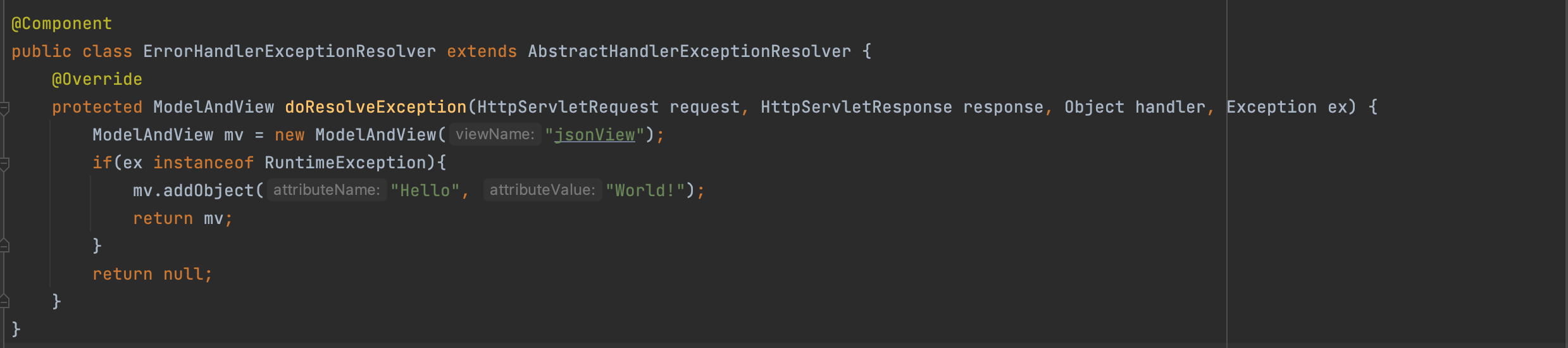 spring에서 기본적으로 제공하는 에러핸들러이고 커스텀해서 이용하는 방법도 있다. HandlerExceptionResolver를 구현한 객체를 빈으로 등록하면 스프링의 에러핸들링리스트에 추가되고 조건을 충족하는 경우 발동하는 매카니즘이다. 기본반환형이 ModelAndView여서 json형태로 리턴하려면 MappingJackson2JsonView를 빈으로 등록해줘야한다(이거 동작방식은 추후 조사하는 걸로..^^)