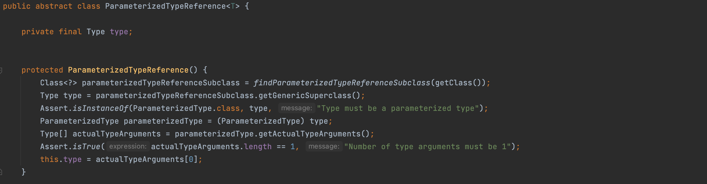 이 개념을 갖고 위에서 보이는 ParameterizedTypeReference의 생성코드를 보면 상속한 클래스의 타입을 리플렉션해서 필드에 저장하는 걸 확인할 수있다. 단, 이 방식이 유효하려면 인스턴스 ParameterizedTypeReference의 인스턴스를 생성해 리플렉션 하는 게 아닌 ParameterizedTypeReference클래스를 상속한 익명클래스를 만들어서 그 익명클래스를 리플렉션하고 그 안에 있는 제네릭 정보를 빼와야 함을 알 수 있다.