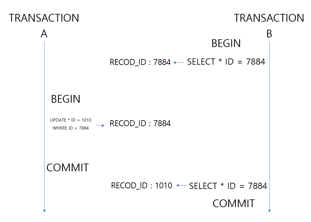 그림에서 보면 TRANSACTION B가 최초 실행한 SELECT * ID 7884 결과는 1이다. 이때 B의 실행이 끝나기 이전에 TRANSACTION A가 레코드 ID를 1010으로 바꿨다고 하자. 이후 B의 동일한 쿼리인 SELECT * ID 7884는 0의 결과를 반환할 것이다.